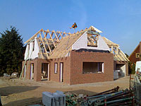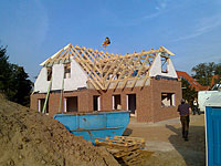 45° Pfettendachstuhl als Winkelbau mit Krüppelwalmen, Material: Konstruktionsvollholz,