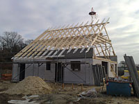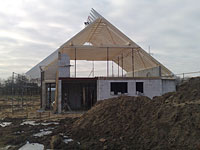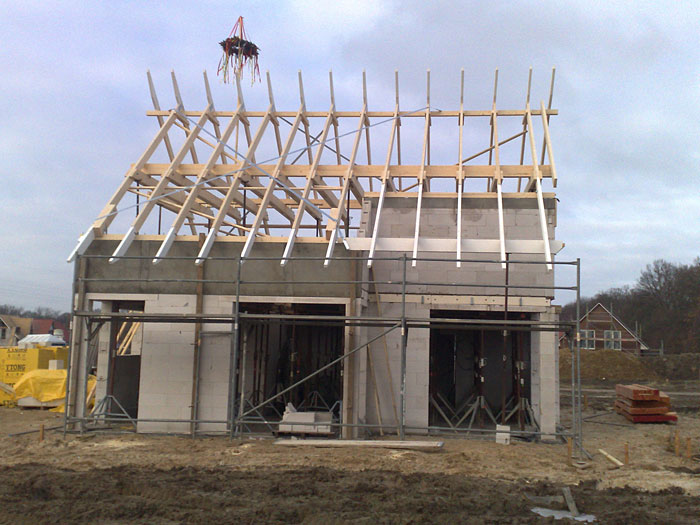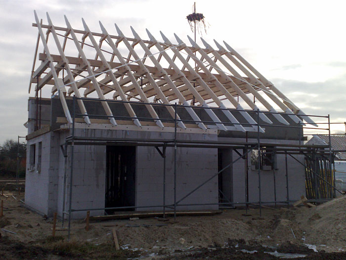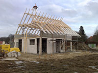 40° Pfettendachstuhl mit sichtbaren Sparrenköpfen, Material: Konstruktionsvollholz,