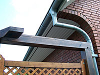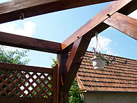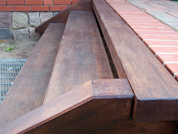aus sichtbarem Fachwerk gezapft und mit Holznägeln versehen, Terrassenaufgang in Eiche